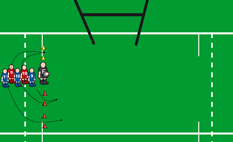 L’éducateur tourne le dos à la défense (en rouge) et leur donne d’un signe la consigne défensive (main ouverte : la défense est écartée / main fermée : la défense est serrée)